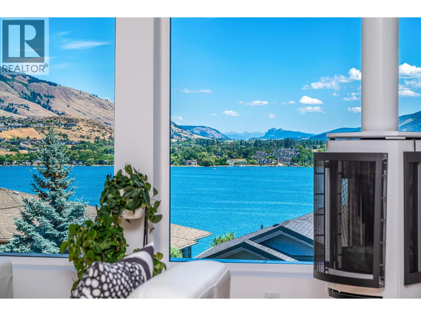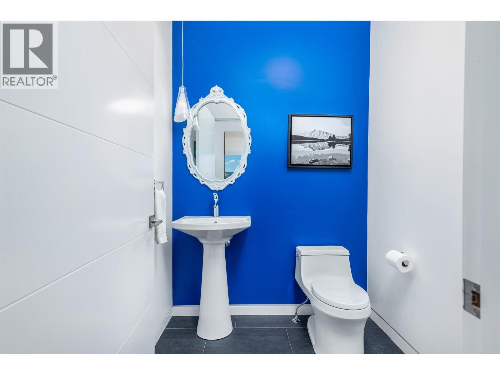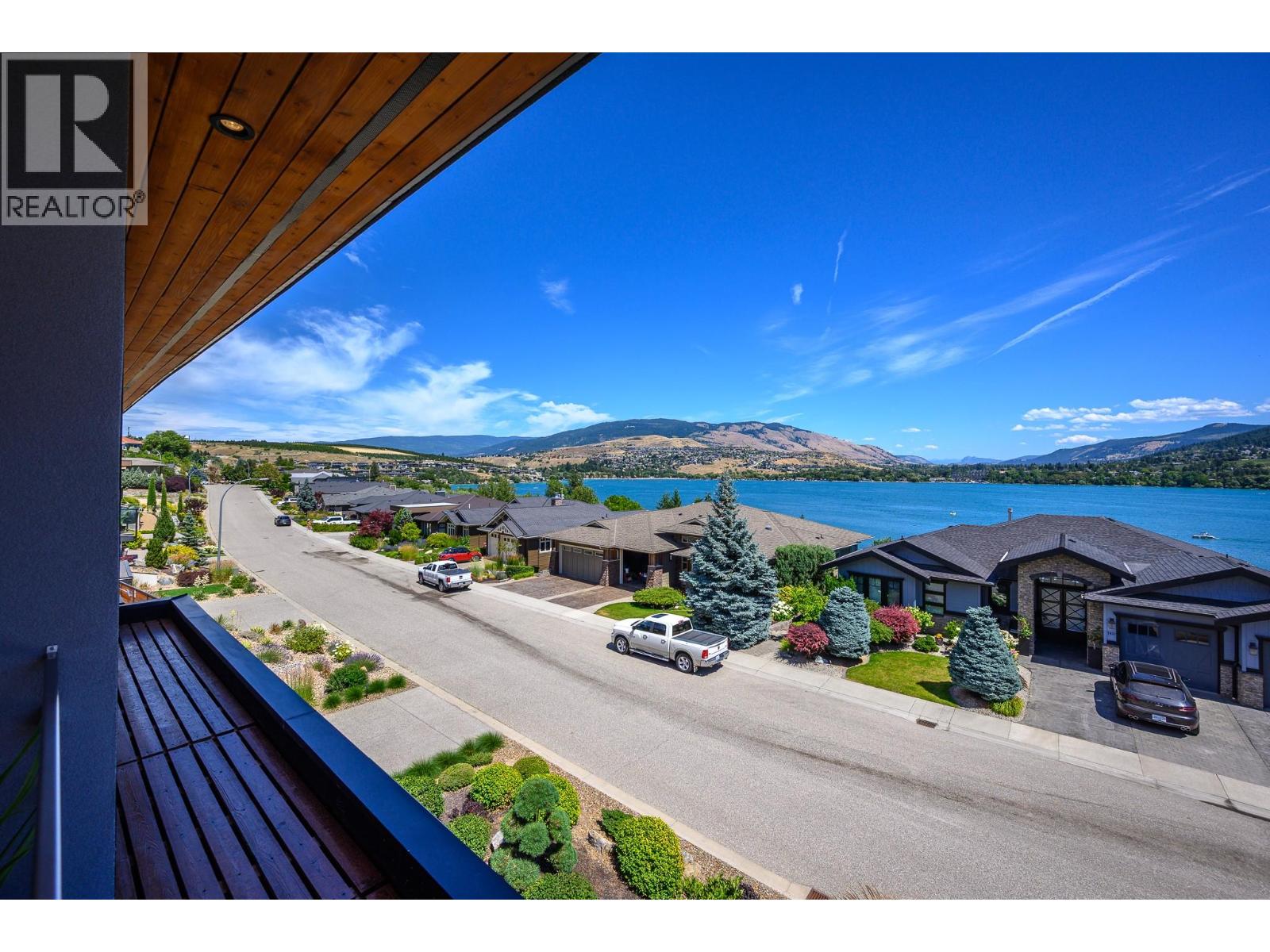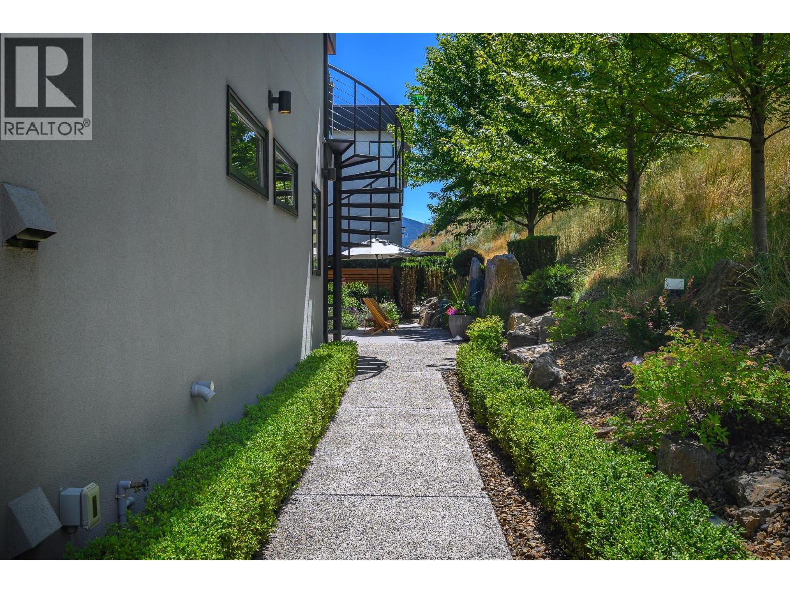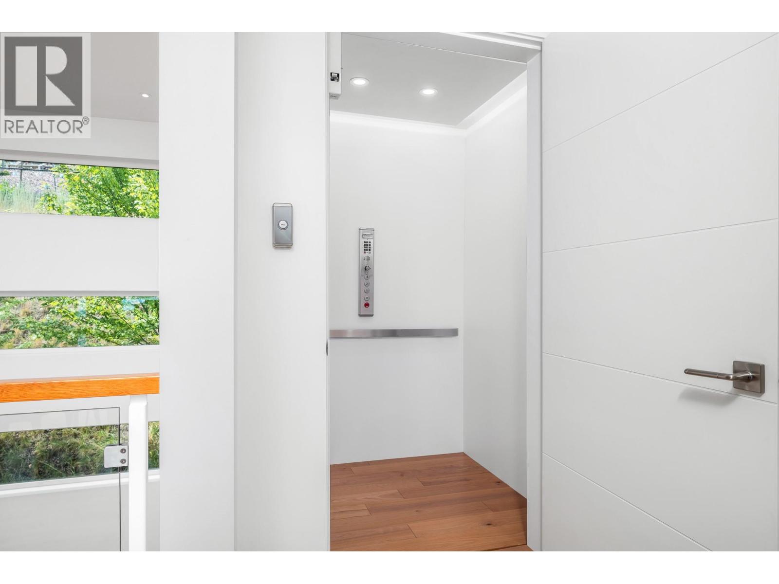 Drawing inspiration from Frank Lloyd Wright, this architecturally stunning home blends modern elegance with intelligent, future-forward design. Thoughtfully designed for aging-in-place, this home features a private elevator, wide doorways, and a barrier-free, sill-less shower, allowing the home to adapt seamlessly through every stage of life. The striking exterior showcases custom metal privacy screens, cedar soffits with integrated pot lighting, concrete planters, and exposed aggregate pathways with built-in stair lighting. A spacious covered deck with glass railings captures breathtaking views of Kalamalka Lake, the Coldstream Valley, and the Monashee Mountains. Inside, 2x8 double-staggered stud construction, 9-zone radiant in-floor heating, and extensive home automation provide comfort and efficiency. Systems control lighting, blinds, water sensors, sound, TV, security cameras, climate, and home monitoring. Beech plank and tile flooring flow throughout, with rubberized tile in the gym. The top-floor kitchen features premium Miele appliances, black quartz countertops, and a large island. The open living and dining area opens to a partially covered deck with BBQ hookup and ceiling heater. The primary suite offers patio access, steam shower, dual vanity, and built-ins. Two additional bedrooms, full bath, den, office, and gym complete this exceptional smart home, finished with integrated storage, epoxy garage, ductless A/C, HRV, humidifier, and hot water boiler. (id:14735)