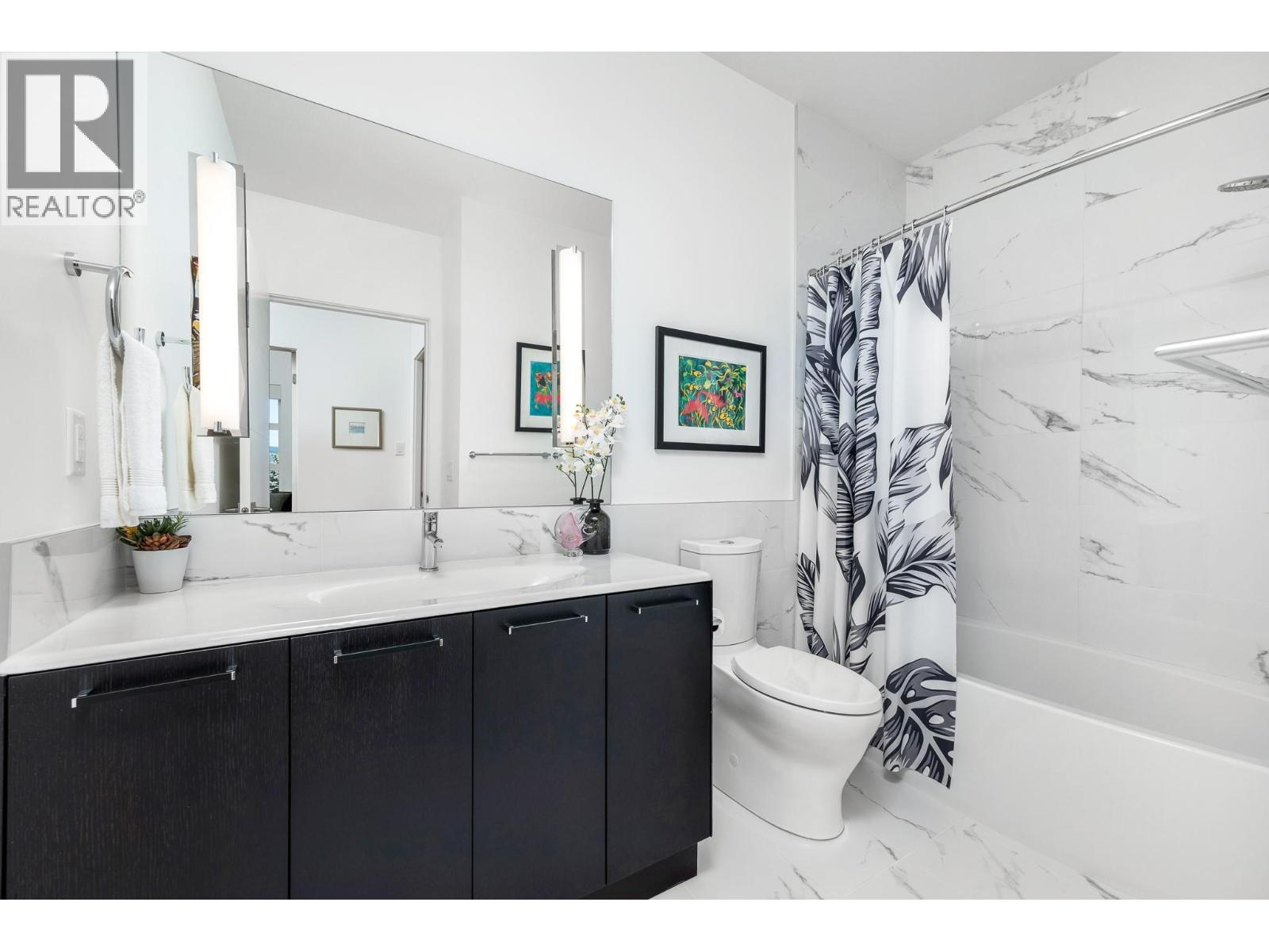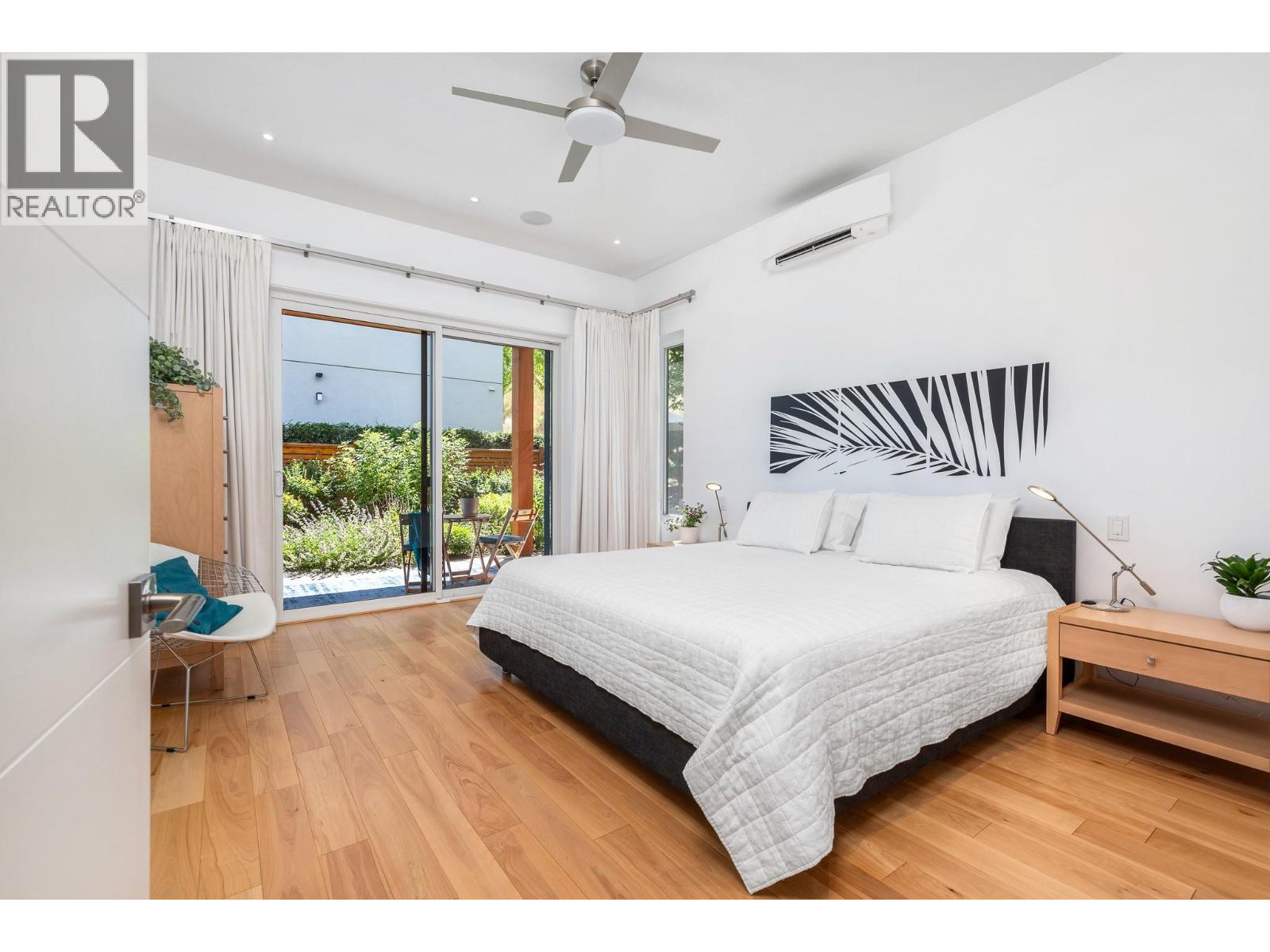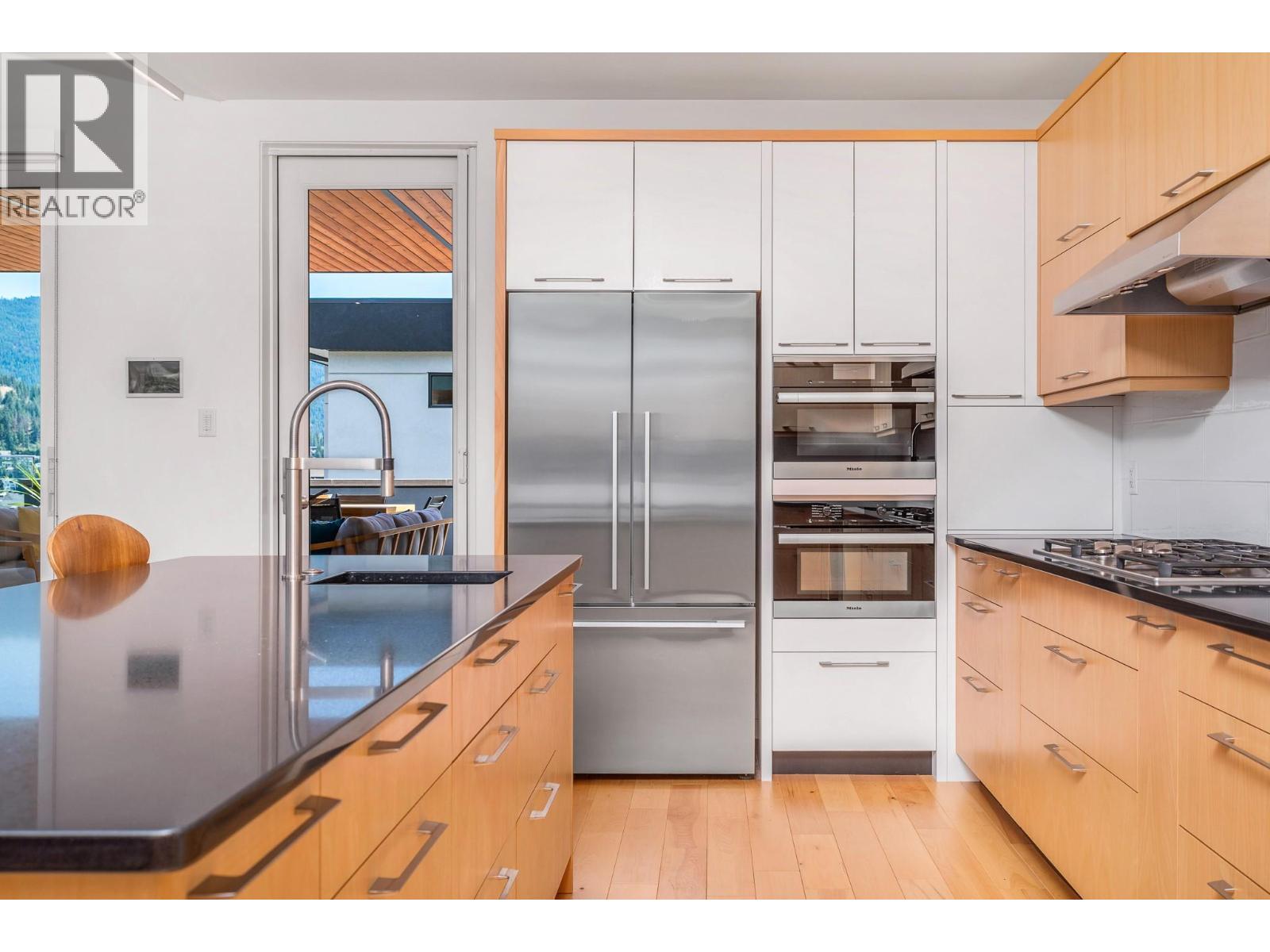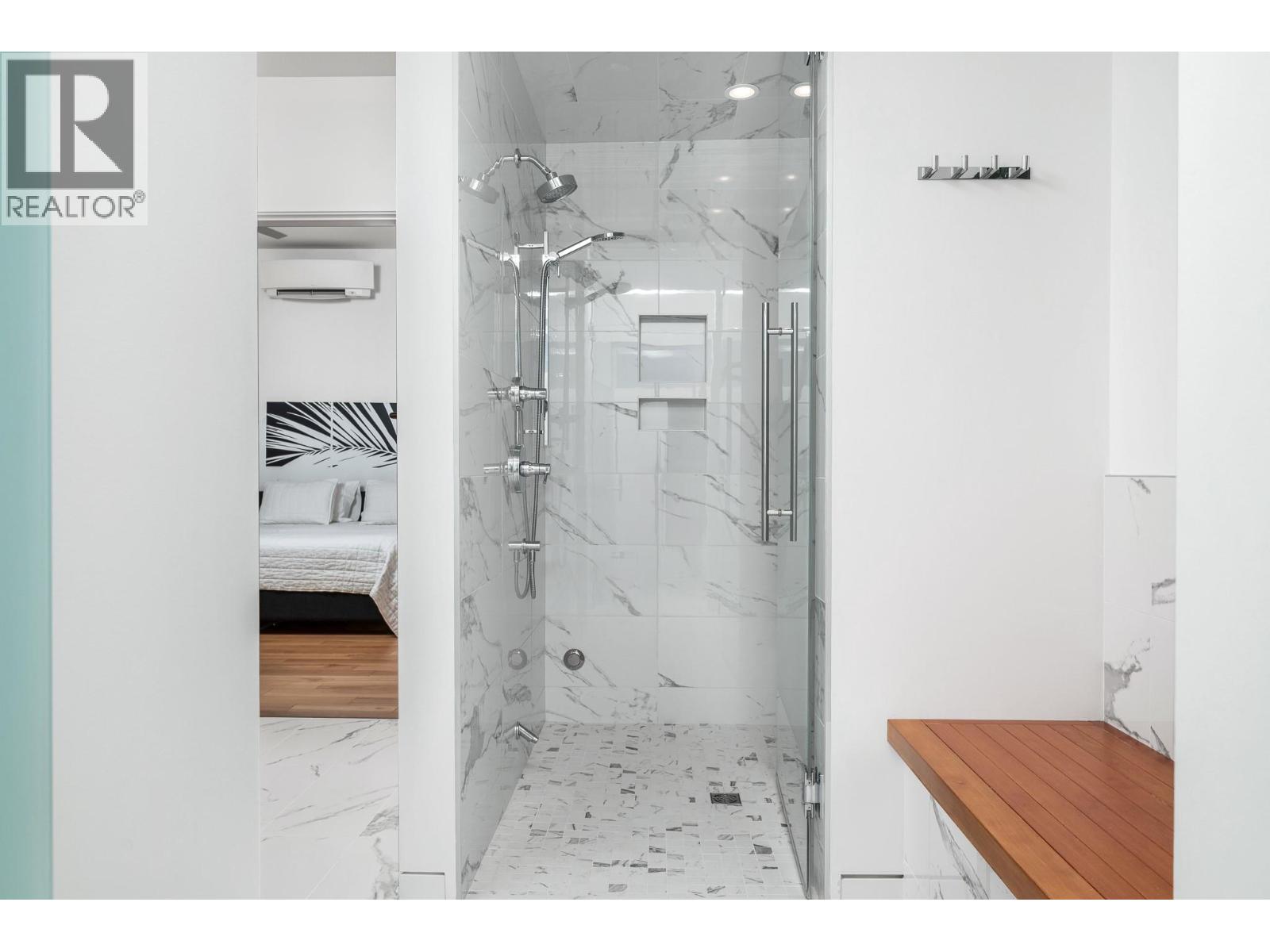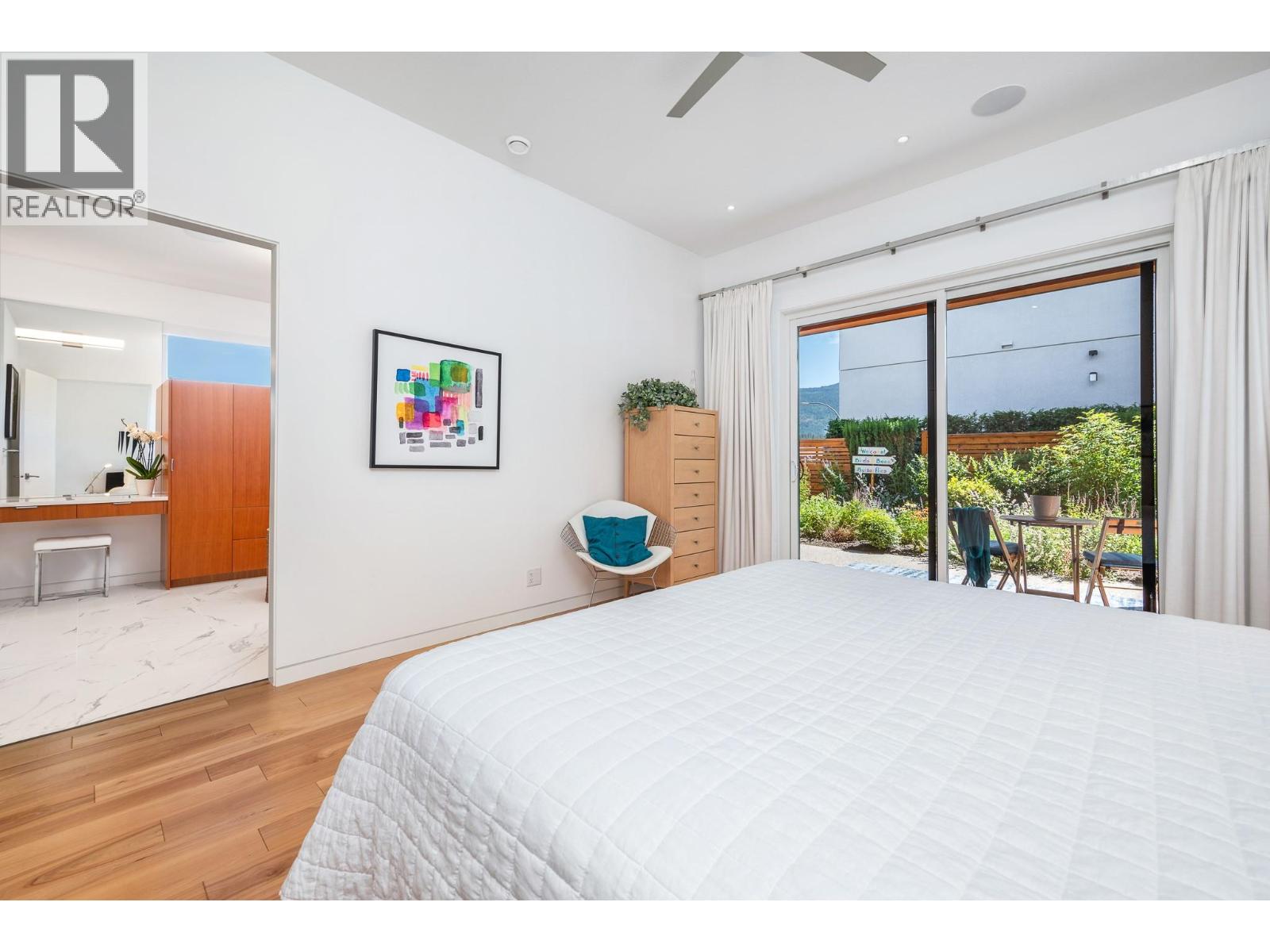 Drawing inspiration from Frank Lloyd Wright, this architecturally stunning home blends modern elegance with intelligent, future-forward design. Thoughtfully designed for aging-in-place, this home features a private elevator, wide doorways, and a barrier-free, sill-less shower, allowing the home to adapt seamlessly through every stage of life. The striking exterior showcases custom metal privacy screens, cedar soffits with integrated pot lighting, concrete planters, and exposed aggregate pathways with built-in stair lighting. A spacious covered deck with glass railings captures breathtaking views of Kalamalka Lake, the Coldstream Valley, and the Monashee Mountains. Inside, 2x8 double-staggered stud construction, 9-zone radiant in-floor heating, and extensive home automation provide comfort and efficiency. Systems control lighting, blinds, water sensors, sound, TV, security cameras, climate, and home monitoring. Beech plank and tile flooring flow throughout, with rubberized tile in the gym. The top-floor kitchen features premium Miele appliances, black quartz countertops, and a large island. The open living and dining area opens to a partially covered deck with BBQ hookup and ceiling heater. The primary suite offers patio access, steam shower, dual vanity, and built-ins. Two additional bedrooms, full bath, den, office, and gym complete this exceptional smart home, finished with integrated storage, epoxy garage, ductless A/C, HRV, humidifier, and hot water boiler. (id:14735)