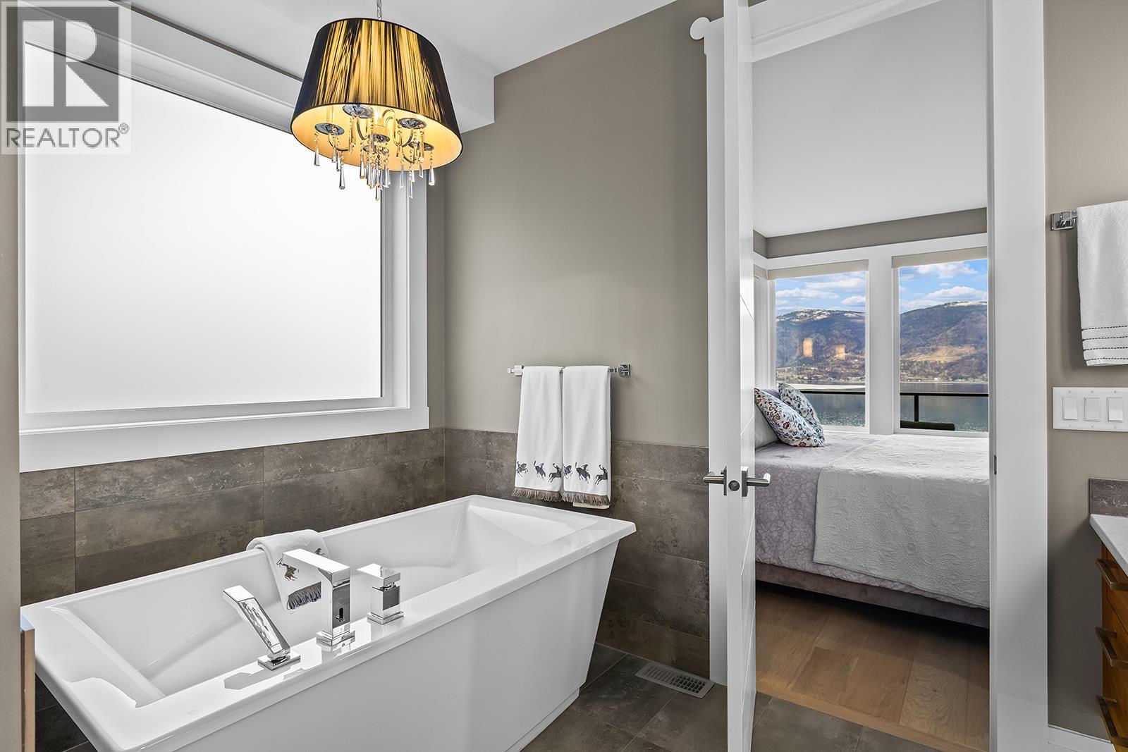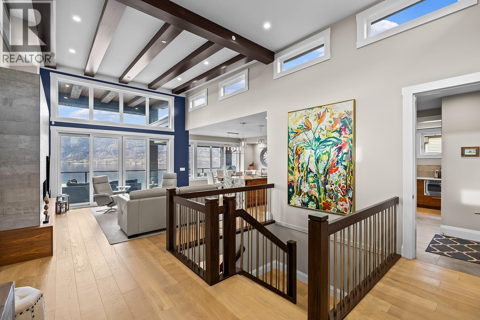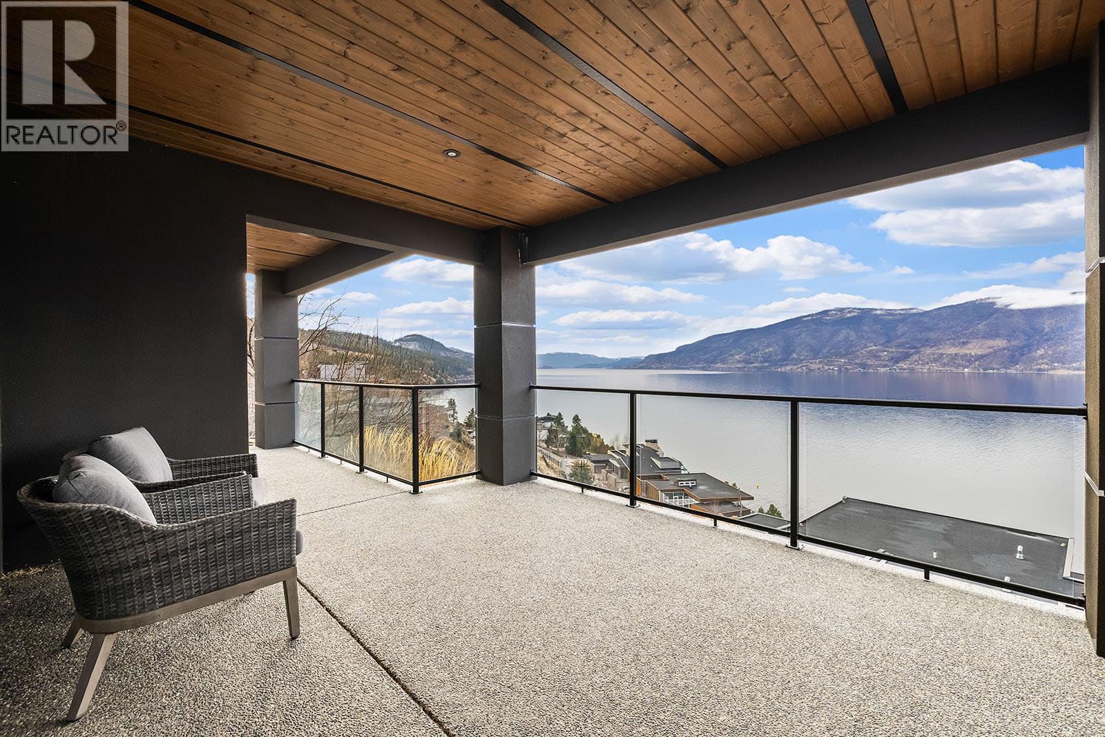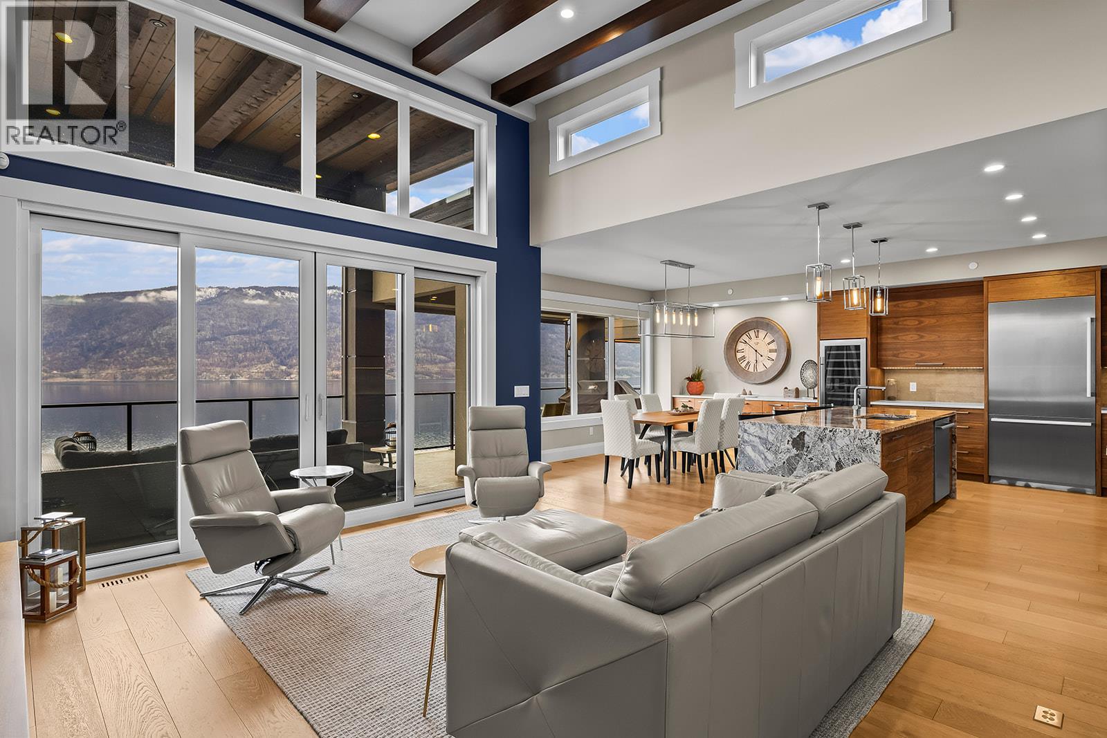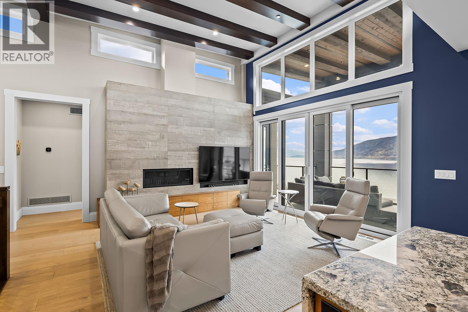 Don't miss out on this stunning home with breath taking views of the lake and mountains in this exclusive Lakestone waterside in lake country. This home has barley been lived in and is in pristine condition. The moment you enter the front door, you're embraced into a space where luxury meets comfort. The panoramic lake view stretches from the bridge in the south to Fintry in the north. Enjoy the main floor great room , with cedar beams, cozy fireplace, professionally designed kitchen with Thermador appliances, stone countertops, dedicated wine fridge and custom horizontal grain walnut cabinetry. The architectural details continue with striking beams leading out to the large deck designed for entertaining, and enjoying the vibrant sunsets. The primary suite on the main floor has a lavish ensuite with oversized walk-in shower, soaker tub, and wiring for hot tub on the aggregate covered deck . The lower level offers a spacious rec. room with a wet bar, 2 additional bed rooms and 2 full bathrooms. The state of the art amenities center in Lakestone include 2 pools, 2 fitness facilities, basket and pickle ball courts, shared dock, endless walking and hiking trails, and a quick walk to the lake access. (id:14735)
