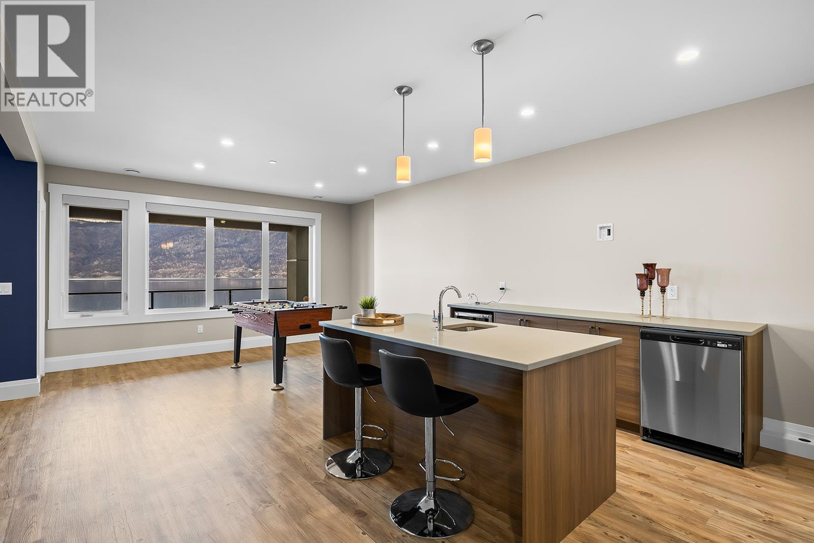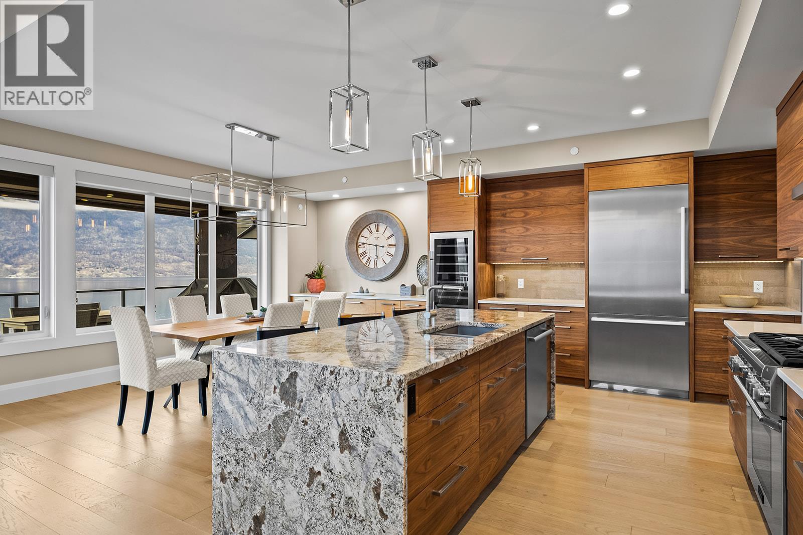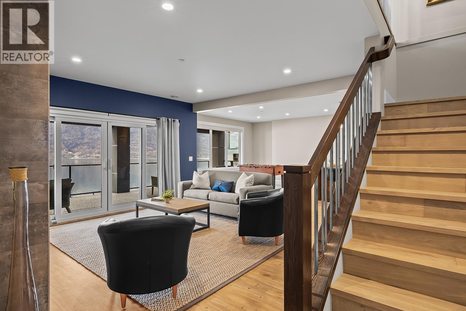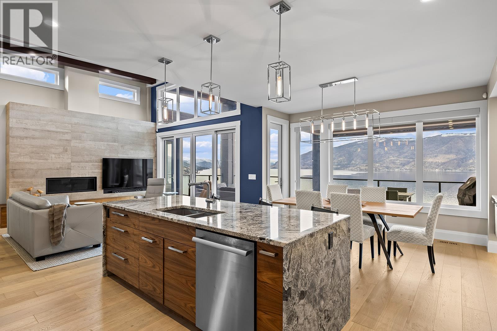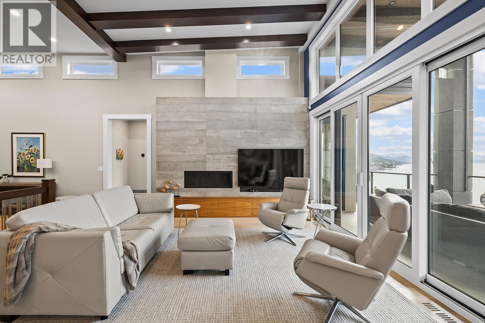 Don't miss out on this stunning home with breath taking views of the lake and mountains in this exclusive Lakestone waterside in lake country. This home has barley been lived in and is in pristine condition. The moment you enter the front door, you're embraced into a space where luxury meets comfort. The panoramic lake view stretches from the bridge in the south to Fintry in the north. Enjoy the main floor great room , with cedar beams, cozy fireplace, professionally designed kitchen with Thermador appliances, stone countertops, dedicated wine fridge and custom horizontal grain walnut cabinetry. The architectural details continue with striking beams leading out to the large deck designed for entertaining, and enjoying the vibrant sunsets. The primary suite on the main floor has a lavish ensuite with oversized walk-in shower, soaker tub, and wiring for hot tub on the aggregate covered deck . The lower level offers a spacious rec. room with a wet bar, 2 additional bed rooms and 2 full bathrooms. The state of the art amenities center in Lakestone include 2 pools, 2 fitness facilities, basket and pickle ball courts, shared dock, endless walking and hiking trails, and a quick walk to the lake access. (id:14735)